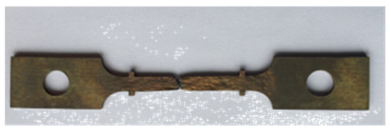 The fracture strain at different temperatures and strain rates was obtained by uniaxial isothermal tensile tests, which were conducted by using a WDW-100 universal testing machine equipped with a stove for heating. The geometry of the sheet samples is presented in Figure 2. They were designed according to the high-temperature tensile test method for metallic materials in GB/T 4338-1995 (the thickness was 2 mm). Each numbered experiment was conducted twice to ensure the accuracy and reliability of the experimental data. The tensile test was controlled by displacement, and the stretching process continued until the sample was broken. The sudden drop in the load magnitude during loading was identified as the moment of fracture. The strain at fracture was determined by measuring the elongation of the gauge. Figure 3 shows the morphology of the specimen after fracture. The fracture strains at different temperatures and strain rates are shown in Table 4 [18]. With the increase in temperature and the decrease in strain rate, the peak stress of the CHN327 alloy decreased, while the fracture strain showed no obvious change in the 600~700 °C temperature range and the strain rate from 0.001 to 0.1 s−1.