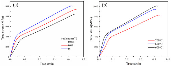True stress—strain curves of CHN327 alloy at (a) different strain rates at 600 °C and (b) different temperatures at 0.1 s−1.