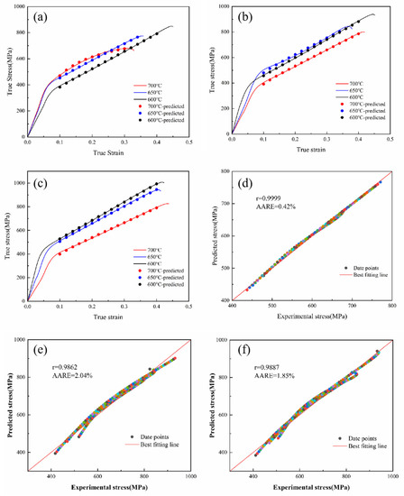 Figure 5 shows the correlation and AARE between the experimental and the predicted stresses for the CHN327 alloy obtained using the modified Voce, Hollomon, and Swift equations. Based on the comparison of the R and AARE, the order of priority was as follows: Rmodified Voce > RSwift > RHollomon; AAREmodified Voce > AARESwift > AAREHollomon. Among Hollomon, Swift, and the modified Voce equations, the modified Voce equation was in the best agreement with the experimental data. The reason may have been that the strain-hardening characteristics of the alloy were different at different stages. The modified Voce equation has a saturated characteristic of strain hardening in a large strain region [30]. In the Hollomon and Swift equations, the actual n parameters vary in different deformation stages, and the n parameters are affected by temperatures, which leads to the deviation between the fitting in the whole range and the actual one to a certain extent [31].
