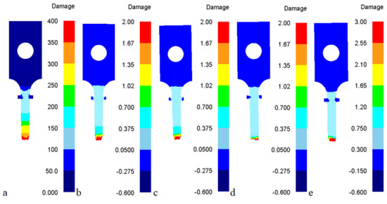 Distributions of the damage values at temperature 600 °C and strain rate 0.1 s−1 in the tensile test with different criteria at fracture moment: (a) Freudenthal model, (b) C&L model, (c) Brozzo model, (d) Ayada model, (e) R&T model.