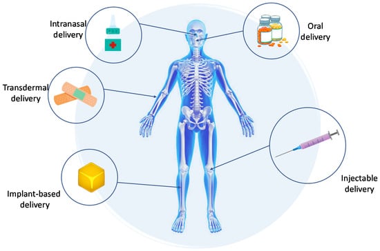 Drug carriers are biologically safe tools for transporting molecules for nutraceutical, pharmaceutical, and cosmetic applications, i.e., in fields of high industrial and scientific interest. According to the report Drug Delivery Systems Market Size, Share and COVID-19 Impact Analysis (Report ID: FBI103070), the global drug delivery systems market size was valued at USD 39.33 billion in 2022 and is projected to grow to USD 71.75 billion by 2029, exhibiting a compound annual growth rate of 9.0%. Only in North America, this market was valued at USD 14.15 billion in 2021. These costs are associated with the need for high financial outlays for research and investment. An estimated 10,000 molecules are generally rejected before one is selected as marketable [1,2]. In recent years, increasing emphasis has been given to using polymeric or composite materials as carriers for active substances, attempting to develop a biomaterial that will carry a therapeutic effect at a specific location in the organism. The reason for this is that the total therapeutic benefit of a drug or other active substance is not proportional to its potency in vitro. Under physiological conditions, active substances meet several barriers, such as aggregation, insolubility, degradation, or impermeability of vascular endothelial cell layers, which are responsible for the drug’s short half-life in vivo as well as non-specific distribution in tissues or poor tissue penetration. Consequently, there is a risk of adverse effects, such as immunogenicity and off-target toxicity [3,4]. The main goal of designing biomaterials for active substance delivery is to release pharmacologically active biomolecules for specific drug action at an optimal rate and dose. Thus, it is possible to personalize such a system, adapting it to the needs of a particular patient (taking into account his/her gender, height, and age) [5]. There are many methods of delivering drugs and active biomolecules, not only orally, but also transdermally or inhaled (Figure 1). However, in the case of bone regeneration, the subject of this review, innovative composites and matrices (i.e., implants) or injectable delivery systems have the most significant potential [6].