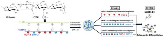 Schematic illustration of the fabrication mechanism and in vitro osteogenic effect of PlGF-2-/BMP-2 nanocomplexes loaded with heparin-HTCC. Reprinted from [71], Copyright 2016 Dove Medical Press Limited.