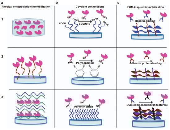 Approaches for the immobilization/encapsulation of growth factors (GFs) to biomaterials. (a1–a3) Physical immobilization techniques. (b1–b3) Non-selective covalent immobilization of GFs through their functional residues. (c1–c3) Extracellular matrix (ECM)-inspired immobilization reactions used for the orientation of GFs on the surfaces of biomaterials. Reprinted from [91], Copyright 2017 Springer Nature Limited.