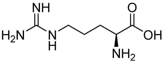 Since arginine (Figure 5) belongs to protein amino acids, it is used not only in the form of RGD sequence but also by itself, especially since it encourages cell attachment, proliferation, and differentiation on HAp surfaces. Therefore, composites similar to those already mentioned are created. A bone-like nanostructure was obtained by using nHAp and Col. The nanostructure was then enriched with l-arginine [124].
