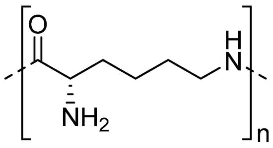 The last protein amino acid worth mentioning is homopolypeptide—polylysine (PL) (Figure 6). PL is utilized in biomaterials due to its high safety, water-solubility, stability, as well as antibacterial properties. It is reported that this AA may also be used to induce embryonic signaling processes during chondrogenesis in cartilage tissue engineering [128]. However, there are no many published studies on its application to cure skeletal system problems. One example is a polymer carrier from PLGA used to deliver this specific biomolecule in the targeted therapy. The surface of PLGA microspheres was first modified by introducing carboxyl groups, and this way, amino acids could be immobilized. Its release in vitro in the presence of MG63 human osteoblast-like cells positively influenced their adhesion and proliferation [129]. Another variant was the modification of poly(3-hydroxybutyrate-co-3-hydroxyvalerate)-HAp/bredigite nanofibrous composite scaffolds. The functionalization of the material was carried out by two methods, the use of the sorption process and covalent attachment. The kinetics of release has not been studied; however, the results suggest the possibility of using such connections in bone tissue regeneration [130].