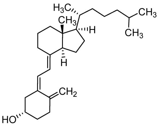 It is well known that vitamin D3 (cholecalciferol, Figure 8) plays a crucial role in remodeling and maintaining proper bone condition [164]. The active form of vitamin D3 (VitD3) used in biomedicine is calcitriol (Cal), produced by its hydroxylation in the liver by 25-hydroxycalciferol hydroxylase [165].