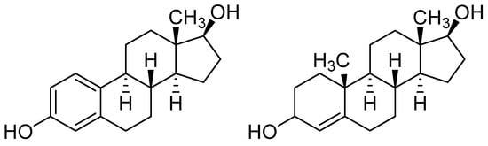 Not only the hormones responsible for regulating calcium levels are essential in controlling skeletal growth and maintaining bone mass as well as strength, but also sex hormones. Both female estrogen and male testosterone (Figure 9) affect the bone in men and women [181]. The relation between changes in bone density and estrogen level is well known. Changes in hormonal economy after menopause, particularly in estrogen expression, are the leading cause of osteoporosis [182]. However, the quantity of testosterone is equally crucial for a healthy skeleton, as it has been shown to directly affect bone cells and bone metabolism [183]. The ability to improve osteogenic differentiation of human bone marrow mesenchymal stromal cells in the presence of estrogen was investigated by introducing this hormone on biodegradable PLGA microparticles. They ensured the intracellular release of biomolecules for seven days, which enabled the effective regulation of MSCs [184]. Estradiol, a primary natural estrogen, has been loaded into PCL/SF microfibers obtained by the electrospun method. The addition of SF increased the bioactivity of the polymer matrix. The sustained release of the hormone from the biomaterial lasted for about three weeks [185]. Its encapsulation provided impressive results regarding estrogen release in PLGA nanoparticles produced via an emulsion-diffusion-evaporation method. Hormone-loaded PLGA NPs were then placed in macroporous HAp-CS scaffolds. The nanoparticles were bonded to the scaffolds in two ways. The first method using embedding ensured the release of biomolecules for 55 days, whereas in scaffolds loaded during manufacture, the controlled release behavior of estradiol was observed for over 135 days [186]. The interesting idea was to use nanodiamond (ND) particles as a carrier. The estrogen-ND complex was then loaded into a photo–crosslinkable methacrylate glycol CS hydrogel (G). The prepared estradiol/ND/G platform increased the beneficial impact of estrogen through extended release with the highest efficiency and safety at a local level [187].