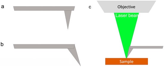 Sketch of (a) the usual tip geometry, (b) the special tip geometry optimized to acquire the Raman-AFM combined measurement; (c) axial coupling between the Raman system and the AFM set up, which highlights the special tip.