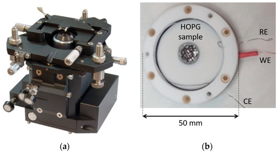 The employed HOPG sample inserted in the EC-cell is clearly visible in Figure 2b. The sample (grade ZYH) was provided by Optigraph and it was exfoliated using adhesive tape before each experiment. A diluted 1 M H2SO4 electrolyte was prepared for the experiment. The solution was purified by bubbling argon for several hours. The mechanical system depicted in Figure 2a was placed vertically above the EC cell.