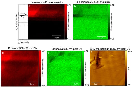 A (20 × 20) μm2 D peak (a) and 2D (b) intensity map acquired during the EC potential sweep (CV reported on the left side of the image); (c) D peak and 2D (d) intensity map acquired at constant 300 mV after the CV and compared to the AFM topography; (e) acquired in parallel to the Raman spectra. All the Raman maps show normalized data with respect to the G peak intensity.