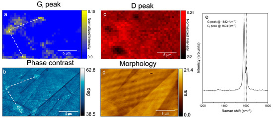 A (12 × 20) μm2 Gi intensity peak map (a) compared to the AFM phase-contrast image (b), the D intensity peak map (c) and the AFM morphology (d) acquired simultaneously in situ and in the same sample area. The Raman spectrum (e) is collected on the brighter areas of (b). All the Raman maps show normalized data with respect to the G peak intensity.