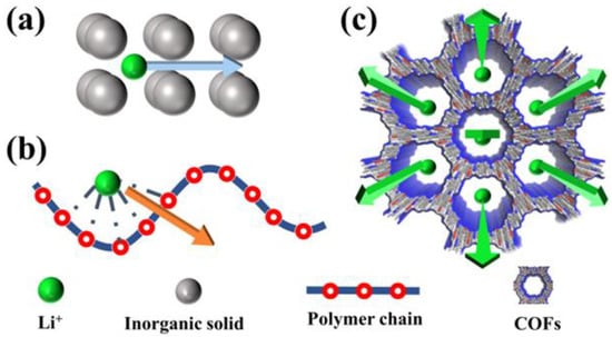 - Sheng, L.; Wang, L.; Wang, J.; Xu, H.; He, X. Accelerated lithium-ion conduction in covalent organic frameworks. Chem. Commun. 2020, 56, 10465–10468. [Google Scholar] [CrossRef]