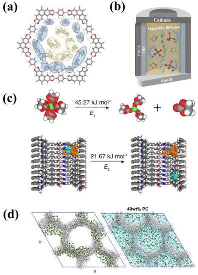 - Zhang, K.; Zhang, B.; Weng, M.; Zheng, J.; Li, S.; Pan, F. Lithium ion diffusion mechanism in covalent organic framework based solid state electrolyte. Phys. Chem. Chem. Phys. 2019, 21, 9883–9888. [Google Scholar] [CrossRef] [PubMed]