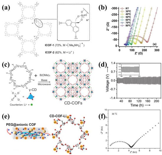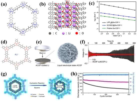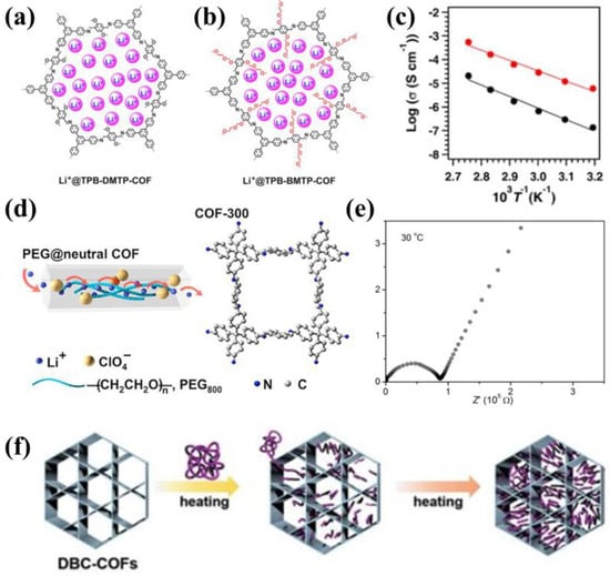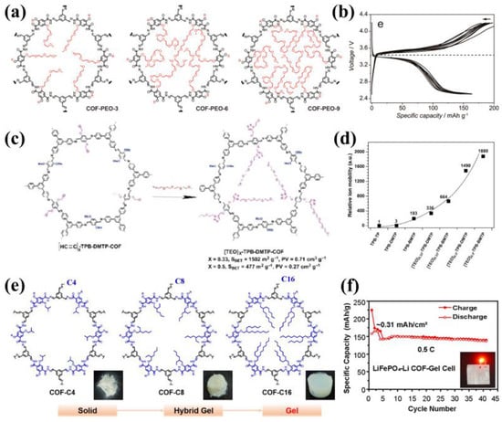 - Gao, Z.; Liu, Q.; Zhao, G.; Sun, Y.; Guo, H. Covalent organic frameworks for solid-state electrolytes of lithium metal batteries. J. Mater. Chem. A 2022, 10, 7497–7516. [Google Scholar] [CrossRef]