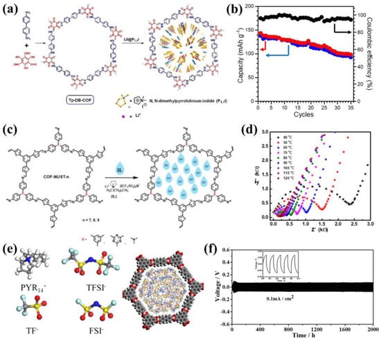 - Wu, Z.; Xu, Q.; Li, J.; Zhang, X.M. Liquid-like Phase of N,N-Dimethylpyrrolidinium Iodide Impregnated into COFs Endows Fast Lithium Ion Conduction in the Solid State. Chem. Eur. J. 2021, 27, 4583–4587. [Google Scholar] [CrossRef] [PubMed]