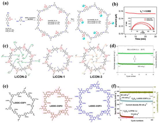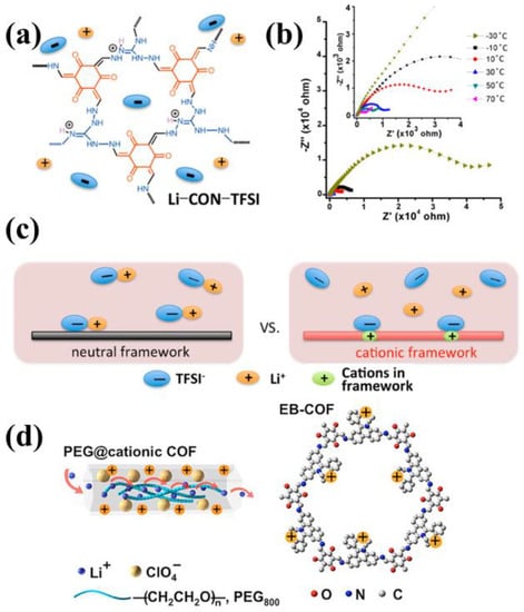 - Li, X.; Hou, Q.; Huang, W.; Xu, H.; Wang, X.; Yu, W.; Li, R.; Zhang, K.; Wang, L.; Chen, Z.; et al. Solution-Processable Covalent Organic Framework Electrolytes for All-Solid-State Li–Organic Batteries. ACS Energy Lett. 2020, 5, 3498–3506. [Google Scholar] [CrossRef]