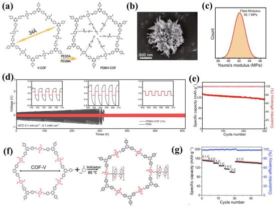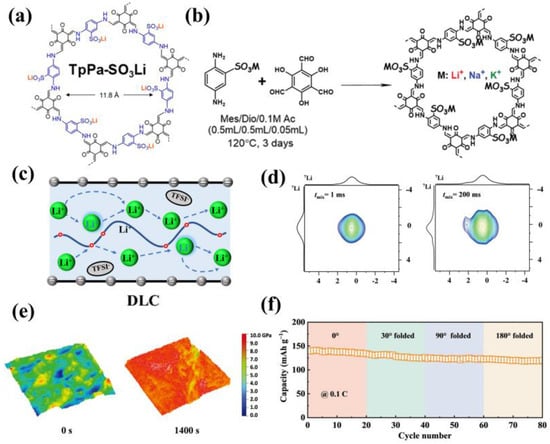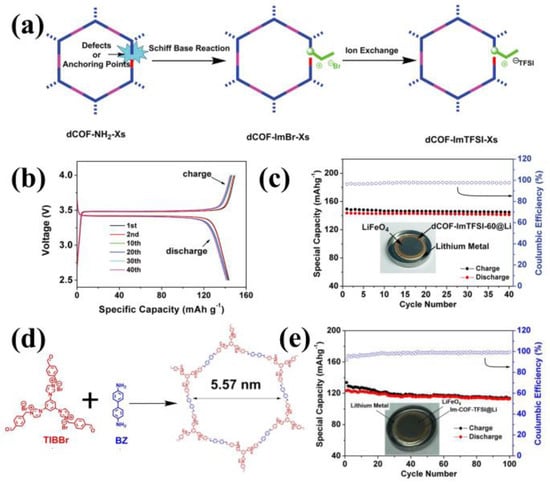 - Zhao, G.; Mei, Z.; Duan, L.; An, Q.; Yang, Y.; Zhang, C.; Tan, X.; Guo, H. COF-based single Li+ solid electrolyte accelerates the ion diffusion and restrains dendrite growth in quasi-solid-state organic batteries. Carbon Energy 2022, 5, 248. [Google Scholar] [CrossRef]