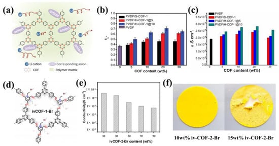 - Wang, Z.; Zheng, W.; Sun, W.; Zhao, L.; Yuan, W. Covalent Organic Frameworks-Enhanced Ionic Conductivity of Polymeric Ionic Liquid-Based Ionic Gel Electrolyte for Lithium Metal Battery. ACS Appl. Energy Mater. 2021, 4, 2808–2819. [Google Scholar] [CrossRef]