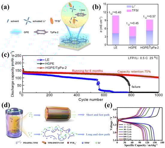 - Lin, Z.; Wang, Y.; Liu, Y.; Zhong, S.; Xie, M.; Yan, F.; Zhang, Z.; Peng, J.; Li, J.; Wang, A.; et al. Regulating solvation structure in gel polymer electrolytes with covalent organic frameworks for lithium metal batteries. Energy Storage Mater. 2022, 53, 917–926. [Google Scholar] [CrossRef]