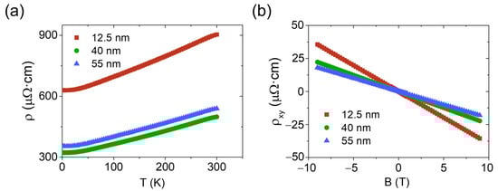 Electrical measurements of Bi2Se3 samples with thicknesses of 12.5, 40, and 55 nm: (a) Thermal dependence of the longitudinal resistivity. (b) Magnetic field dependence of the Hall resistivity measured at 2 K.