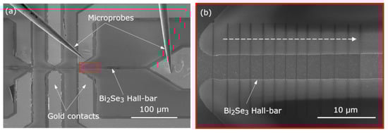 For the purpose of this work, several 4 μm-wide Hall-bar devices were prepared by optical lithography from Bi2Se3 thin films of 12.5, 40, 45, 52, and 55 nm thickness (information for the 45 nm sample is used in the Supplementary File) [18,19,20]. The films were grown by Pulsed Laser Deposition (PLD) on sapphire (001) substrates. Their crystallinity was characterized by X-ray Diffraction (XRD), whereas the presence of topological surface states was validated by Angle-Resolved Photoemission Spectroscopy (ARPES). The lithography process was carried out in an MA6 mask-aligner from SUSS MICROTEC (Garching bei München, Germany) following a two-step process, with a first standard etching process to define the Hall bar, and a second lift-off process in order to define the electrical contacts. For the etching, an ion milling machine model 600 from SISTEC (Chemnitz, Germany) was used, whereas an Auto500 e-beam evaporator from BOC Edwards (Burgess Hill, UK) was employed for the growth of the gold contacts.