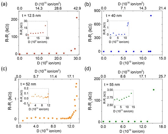 Change in electrical resistance , calculated as the difference between the resistance after (R) and before () irradiating a line with a given dose value (D), as a function of the ion dose for samples with four different thicknesses: 12.5 (a), 40 (b), 52 (c), and 55 nm (d). In the lower x-axis, the dose is expressed in ion/cm, whereas in the upper one, it is expressed in ion/cm2, considering the beam spot diameter. The insets show the low ion dose region in more detail.