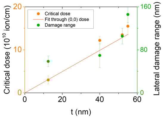 Critical dose with linear fitting and lateral damage range plotted against thickness.