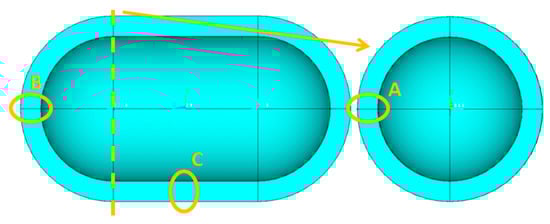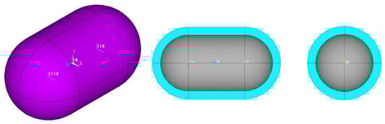 - The temperature and pressure conditions that apply inside and outside the tank and constitute the thermal and structural loads of the tanks under investigation, as “non-integral”, are the only ones they undergo (in contrast to the integral ones, they do not undergo the aerodynamic loads that the aircraft structure (fuselage and wings) receives). The temperature of the hydrogen is therefore taken to be equal to −253 °C (20 K), while the pressure in the volume enclosed by the inner shell is equal to 170 kPa [27]. The temperature of the external environment is taken, indicatively and by no means limiting, as equal to 10 °C (283 K).