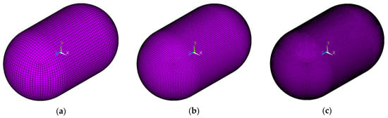 For an examination of the tank mesh convergence, different mesh sizes regarding both the in-plane size of the elements and the through-thickness one were chosen (Figure 4). More specifically: