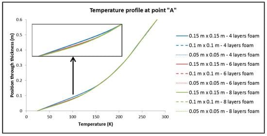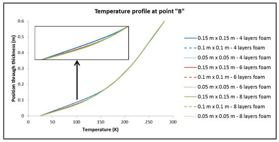 To control the resulting different mesh densities, the following quantities are considered: (a) The thermal output of the tank; (b) the maximum and minimum temperature overall in the tank; (c) the distribution of temperatures (temperature profile) in three points of the tank, focusing on the part of the insulation where the main part of the change in temperatures between the inside and the outside of the tank occurs (points of interest depicted in Figure 5). Following the above, Table 3 is made, where the results related to the aforementioned elements are recorded, as well as Figure 6, Figure 7 and Figure 8, where the temperature distribution through the insulation thickness at the three different points of Figure 5 is depicted.