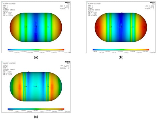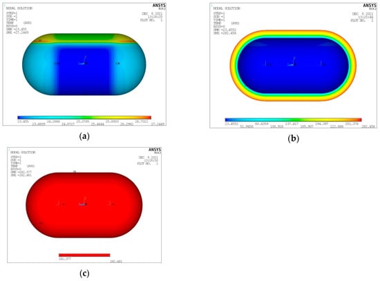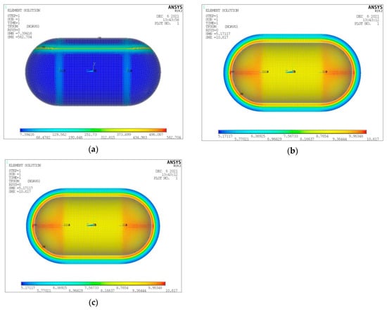 As already mentioned, the maximum LH2 filling percentage of the volume enclosed in the inner tank shell is of a level of 93% [26]. The remaining space is occupied by gaseous hydrogen (GH2). Regarding the performed numerical analyses, the LH2 tank fullness percentage affects the convection coefficient in the interior of the tank, with the values for GH2 and LH2 already given in Section 2. At this point, and for the same form of tank considered in the convergence study presented above (Vtotal = 100 m3, λ = 0.5, φ = 1, ψ = 1), a thermal and structural analysis is performed for a tank filled with LH2 at the maximum percentage of 93%. In the following Figure 9, Figure 10, Figure 11 and Figure 12, the depiction of the following results is included: