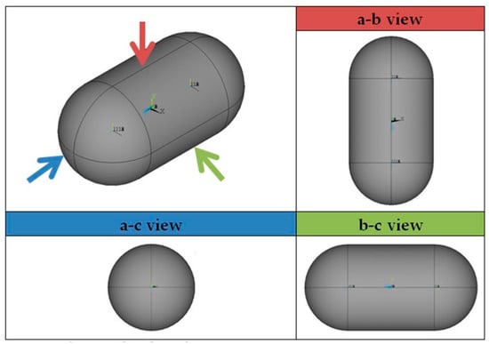- The shape of the considered tanks. To produce all of the tank geometries considered, the method of triaxially symmetric tank geometries followed by Winnefeld et al. [5] was adopted. According to it, three (3) characteristic tank size ratios, λ, φ and ψ, are enough to describe its shape, as shown in Figure 1. These ratios are connected to the dimensions a, b and c of Figure 1, which are emphasized as being the semi-axes of three (3) ellipses (a–b, a–c, b–c), which, together with the length of the central part of the tank, ls, completely describe the tank.