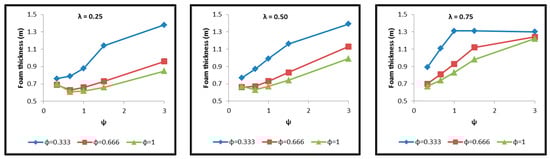 Distribution of the required insulating material thickness for maintaining the boil-off rate at 0.1%/h as a function of the ratios λ, φ and ψ.