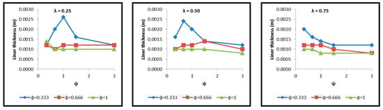 Distribution of inner aluminum shell thickness for evaluation of the Von Mises criterion as a function of the ratios λ, φ and ψ.