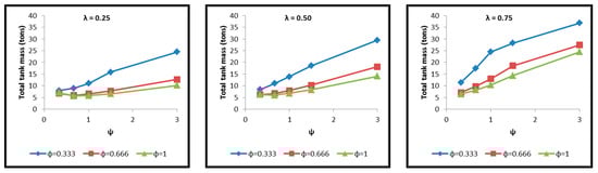 Distribution of total tank mass as a function of the ratios λ, φ and ψ.