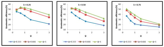Distribution of the tank gravimetric efficiency as a function of the ratios λ, φ and ψ.