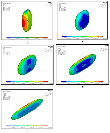 Figure 23. Characteristic tank case with transition of the maximum Von Mises stress between different tank regions (λ = 0.25, φ = 0.333, ψ = 0.333 (a), 0.666 (b), 1 (c), 1.5 (d), 3 (e)). - Concerning the total mass of the tank (Figure 21), it is already clear from the above that it follows the distribution of the mass of the insulating material, since this constitutes the overwhelmingly greater percentage of the total mass of the tanks, since in all cases this percentage is within the range 87–95%.