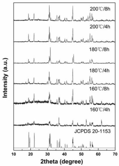 The crystal phases of Na3ScF6: 20% Yb3+, 2% Er3+ particles prepared under different reaction conditions were analyzed by X-ray diffraction (XRD). The XRD patterns are shown in Figure 1. It can be seen that the diffraction peaks of the prepared samples correspond well to the standard card of the monoclinic-phase Na3ScF6 (JCPDS card no. 20-1153), and no other impurities could be detected when the temperature was 160 °C and the reaction time was 4 h. When the reaction temperature was constant and the reaction time was increased to 8 h, the diffraction peaks could also be indexed to the standard card of the monoclinic-phase Na3ScF6. This shows that the samples we prepared were monoclinic-phase Na3ScF6. With a temperature of 180 °C and a reaction time of 4 h or 8 h, the XRD patterns of the prepared samples corresponded well to the monoclinic-phase Na3ScF6 (JCPDS card no. 20-1153). The above results show that the prepared samples were pure monoclinic-phase Na3ScF6. When the temperature reached 200 °C and the reaction time was 4 h or 8 h, similarly, the prepared samples also corresponded to the standard card of monoclinic-phase Na3ScF6. The above results show that at 200 °C and with a reaction time of 4 h or 8 h, the samples were monoclinic-phase Na3ScF6. Therefore, it can be seen that when both the temperature and reaction time were varied, the crystal phases of the samples did not change, such that monoclinic-phase Na3ScF6 could be synthesized, nor did the doping with Yb3+ ions and Er3+ ions change the crystal structures. However, it can be seen that as the temperature increased and the reaction time increased, the relative peak intensity increased and the diffraction peaks sharpened, indicating that temperature and reaction time can have an effect on the size of samples. The higher the temperature and the longer the reaction time, the higher the degree of the sharpening of the diffraction peaks and the larger the size of the samples. When the reaction temperature was 160 °C and the reaction time was 4 h, the size of the Na3ScF6 particles was the smallest—only about tens of nanometers—and the shape was spherical; the particles clustered together and they did not form obvious crystals; in other words, the crystallinity was not high and the crystal grains were small, which led to a significant reduction in peak intensity, and some of the peaks even disappeared.
