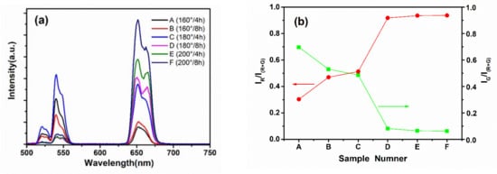 Figure 4b shows the ratios of green emission intensity IG and red emission intensity IR to the total integrated intensity I(G+R) of sample A (160 °C, 4 h), sample B (160 °C, 8 h), sample C (180 °C, 4 h), sample D (180 °C, 8 h), sample E (200 °C, 4 h) and sample F (200 °C, 8 h) under different reaction conditions in the range of 500–750 nm. It can be seen from Figure 4b that when the reaction temperature was 160 °C and the reaction time was 4 h (sample A), the green emission intensity IG accounted for 70% of the total integrated intensity I(G+R), while the red emission intensity IR accounted for 30%. When the reaction temperature was 160 °C and the reaction time was 8 h (sample B) and when the reaction temperature was 180 °C and the reaction time was 4 h (sample C), the green emission intensity IG was not much different from the red emission intensity IR, which was about 50%, but when the reaction temperature was 180 °C and the reaction time was 8 h (sample D) and when the reaction temperature was 200 °C and the reaction time was 4 h (sample E) and when the reaction temperature was 200 °C and the reaction time was 8 h (sample F), the green emission intensity IG only accounted for 5% of the total integrated intensity, while the red emission intensity IR was as high as 95%. It was found that with increases in temperature and time, the ratio of IG in I(G+R) gradually decreased, while IR accounted for I(G+R) gradually increasing, and the color of the corresponding samples changed from green to red. As can be seen in Figure 3a, which shows the fluorescence spectra, the emission peaks were centered at 520 nm/543 nm and 654 nm, corresponding to the 2H11/2/4S3/2 → 4I15/2 (green-upconversion luminescence) and 4F9/2 → 4I15/2 (red-upconversion luminescence) transitions, respectively. When the temperature was 160 °C, the size of our samples was at the nanometer level; as the reaction time increased from 4 h to 8 h, the size of the nanocrystals increased slightly and it was found that the green emission decreased and the red emission increased, as can be seen in Figure 3b. When the temperature was 180 °C and the reaction time was 4 h, the samples we prepared had both nanometric and micrometric sizes, the green fluorescence intensity of the samples was weakened and the red fluorescence intensity of the samples was enhanced, compared with the samples prepared when the reaction temperature was 160 °C. When the temperature was 180 °C, as the reaction time increased from 4 h to 8 h, a sharp decrease in green emission at 520 nm/543 nm and a sharp increase in red emission at 654 nm were observed. The above results can be seen in Figure 4b. When the reaction temperature was 200 °C, as the reaction time increased from 4 h to 8 h, the size of the samples increased slightly, and it was found that both had low green emission at 541 nm and slightly higher red emission at 654 nm for the reaction time of 8 h. When the reaction time was kept constant at 4 h or 8 h, the red emission at 654 nm increased gradually as the temperature increased, as was observed in the fluorescence spectra corresponding to the green-luminescence intensity of the samples decreasing gradually and the red-luminescence intensity of the samples increasing gradually. This was due to the small radius of the Sc3+ ions, which is only 0.83 Å., making the distance between Sc3+-Sc3+ in the Na3ScF6 host shorter, so that when the doped Yb3+ ions and Er3+ ions enter the host to occupy the position of the Sc3+ ions, the distance between the Yb3+ ions and Er3+ ions is reduced, increasing the probability of cross-relaxation, making it easier for Er3+ ions to jump to higher energy levels, such as 4F9/2; in addition, as the temperature and reaction time increase, the surface defects decrease in the wake of the size of the nanocrystal increase, and the energy-transfer upconversion efficiency is much higher than the surface-defect effect, so the green fluorescence intensity of a sample shows a gradual weakening trend, and the red l fluorescence intensity of a sample shows a gradual weakening trend.