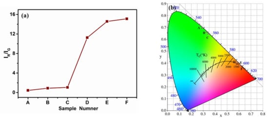 Figure 5a shows the ratios of red emission intensity IR to green emission intensity IG of Na3ScF6: 20% Yb3+, 2% Er3+ samples under different reaction conditions in the range of 500–750 nm. Figure 5b shows the CIE color chromaticity coordinates of Na3ScF6: 20% Yb3+, 2% Er3+ samples under different reaction conditions. When the temperature was 160 °C and the reaction time was 4 h, the size of the Na3ScF6: 20% Yb3+, 2% Er3+ samples was the smallest; at this point in time, the IR/IG ratio was about 0.435 (as shown in Figure 5a), and the sample produced green-upconversion luminescence, which could be shown by Figure 5b. When the temperature remained constant and the reaction time increased to 8 h, the size of the Na3ScF6: 20% Yb3+, 2% Er3+ samples increased slightly; at this point in time, the IR/IG ratio was about 0.885 (as shown in Figure 5a), and from this it can be seen that when the temperature was 160 °C, the size of the samples increased and the IR/IG ratio expanded by a factor of ~2 as the reaction time increased. The calculated CIE color coordinates were slightly offset away from the green area, as can be seen in Figure 5b. When the temperature was 180 °C and the reaction time was 4 h, the sample size increased but the surfaces attached to many small particles; at this time, the IR/IG ratio was ~1.053 (as shown in Figure 5a) and the calculated CIE color coordinates were further shifted away from the green area (as shown in Figure 5b). When the temperature was 180 °C and the reaction time was 8 h, the size of the samples increased, and the diameters of the small particles attached to the surfaces also increased; at this point, it was clear that the IR/IG ratio was ~11.248. Therefore, we found that when the temperature was 180 °C, with an increase in reaction time, the size of the samples increased and the IR/IG ratio expanded ~25 times, compared with 160 °C reaction temperature and the 4 h reaction time. It also can be seen from Figure 5a that when the reaction temperature was 180 °C and the reaction time was 8 h, the IR/IG ratio of the samples was about 10.6 times that when the reaction temperature was 180 °C and the reaction time was 4 h. As can be seen from Figure 5b, when the temperature was 180 °C and the reaction time was 8 h, the sample produced orange-upconversion luminescence and the calculated CIE color coordinates were located in the red region. As can be seen in Figure 5a, when the reaction temperature was 200 °C and the reaction time was 4 h or 8 h, the IR/IG ratios of the samples were ~14.571 and ~15.106, respectively. The calculated CIE color coordinates almost overlapped and were located in the red area. These two samples produced red-upconversion luminescence, and the results can be seen in Figure 5b.