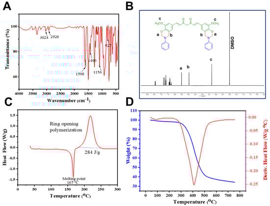 Characterization of Cu-A-Bzo and poly(Cu-A): (A) FTIR spectrum of Cu-A-Bzo; (B) 1H-NMR spectrum of Cu-A-Bzo; (C) DSC thermogram of Cu-A-Bzo; (D) TGA thermogram of poly(Cu-A).