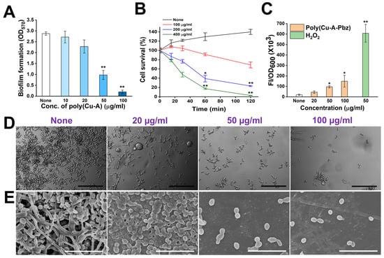 Evaluation of antifungal and antibiofilm potency of poly(Cu-A) compared to C. albicans DAY185: (A) biofilm formation of C. albicans DAY185 in the existence of poly(Cu-A); (B) rapid killing of C. albicans by poly(Cu-A), after incubation of 2 h with poly(Cu-A); (C) Poly(Cu-A)-induced ROS production by C. albicans; (D) hyphae were pictured after incubation over 24 h; (E) SEM analysis of C. albicans biofilm against poly(Cu-A). Scale bars: black = 100 µm, white = 20 µm. The findings are explained as means ± SDs of triplicate. The error bars indicate standard deviations. ** p < 0.01 and * p < 0.05.