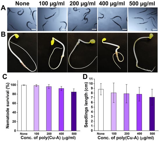Poly(Cu-A) safety profile: (A) effects of poly(Cu-A) on C. elegans and (B) seed germination; (C) graph indicating the % of nematode survivals treated with poly(Cu-A) for five days; (D) the effects of poly(Cu-A) on seedlings length after seven days. Scale bar = 100 µm.