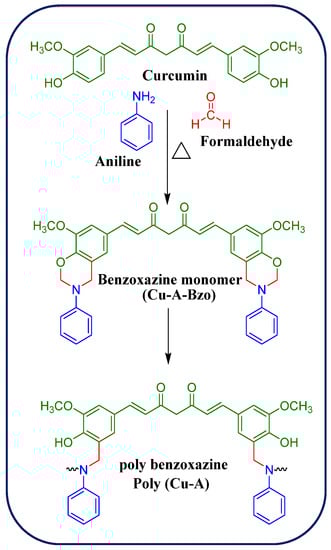 Polybenzoxazines are high-performance thermosetting resins produced by the polymerization of benzoxazine monomers produced by Mannich condensation from formaldehyde, phenol, and amine, which provides considerable flexibility as different amine and phenol precursors can be used. Furthermore, benzoxazine monomers undergo thermally induced ring-opening polymerization (ROP) to form polybenzoxazines. These polymers have many advantages, such as zero shrinkage upon curing, no release of volatile products, low water absorption, appreciable mechanical and thermal properties, and superior chemical and electrical resistance properties, and thus, they have many applications [1,2,3]. Curcumin is a polyphenolic compound available abundantly in turmeric (Curcuma longa). It is extensively used in the medicinal field as it functions as an antioxidant, antibacterial, antiviral, and anti-inflammatory agent [4,5]. Additionally, due to the existence of –OH groups in its structure, curcumin can be used in the synthesis of several monomers or can be made to blend with several polymers, where the –OH functional group is required [6,7].