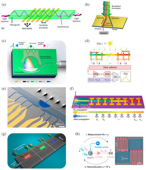 In April 2020, Zheng and co-workers, presented a monolithic spectrometer with a dispersive photodiode array integrated into a single composition-graded CdSxSe1−x nanowire (Figure 3f). The device operated in a waveguide mode. The nanowire, enhancing light–matter interaction, was the CdS of a 2.42 eV (optical) bandgap on one end and the CdSe of a 1.74 eV bandgap on the other, and it functioned as a wavelength selective component. A 5 nm spectral resolution and 1013 Jones room-temperature detectivity were exhibited. This presentation has made new progress in high-resolution and sensitive detection in on-chip spectroscopy [65]. In July 2020, Yun et al. demonstrated a design for a single-photon spectrometer using SNSPDs in cascaded photonic crystal (PC) structures (Figure 3g). The structure of this spectrometer contained a wavelength division multiplexing filter with the ability to resolve wavelengths, which was composed of a bus waveguide coupled to a planar array of PC nanocavities with different resonant wavelengths. Since the superconducting nanowires were located next to a single cavity, there was an evanescent coupling between the two, which could allow the nanowires to absorb the light captured in the cavity, and thus, detect the presence of a single photon. Through their analysis, absorption efficiencies reached ~80% in the structure with four cascaded cavities or two cascaded cavities, and the spectral resolution achieved was about 1 nm [66].