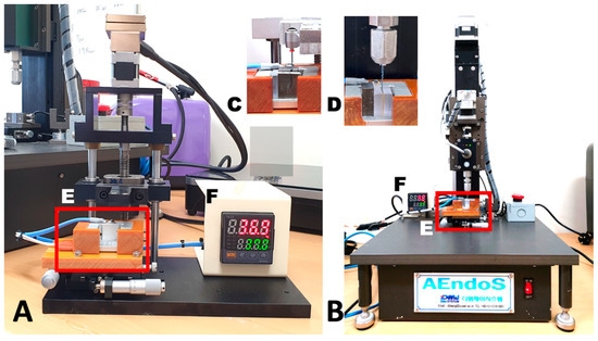 Test devices used in this study. (A) Tester (EndoC) for cyclic fatigue resistance test, (B) tester (AendoS) for torsional resistance test, (C) simulated canal in the heat generation pad, (D) Brass plates and polycarbonate blocks holding the file tip, (E) heat generation pad, and (F) electronic heat controller.