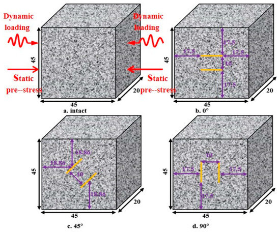 First, the rock samples were cut from the rock mass in the undisturbed part. In order to obtain a clearer observation of crack evolution, a single granite with good geometric integrity and uniformity was cut to obtain prismatic samples with a height, width and thickness of 45, 45 and 20 mm, respectively, which proved the feasibility and effectiveness of prismatic rock samples in an SHPB test. Then, the high-pressure water jet cutting machine was used to cut the rock specimens into length, width and thickness of 10 mm, 1 mm and 1 mm parallel cracks at different angles (0°, 45° and 90°). The geometry of the precut specimens is shown in Figure 2. After cutting the specimen rocks, the loading ends of all specimens were polished according to the standards of the International Society of Rock Mechanics (ISRM). The samples with different flaws were divided into 6 groups. The detailed geometric dimensions and mechanical parameters of each group are shown in Table 1. Among them, Int represents the complete sample, and S0-flaw0°-1 represents the first sample of a 0° fracture sample at 0% UCS.