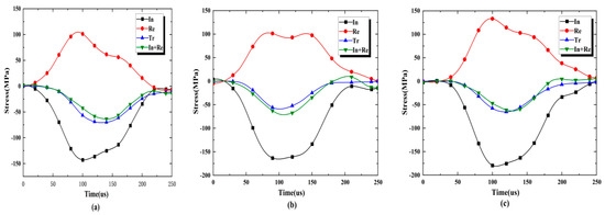 Dynamic stress equilibrium in specimens: (a) SA-flaw0°-2, (b) SB-flaw45°-1 and (c) SC-flaw90°-2.