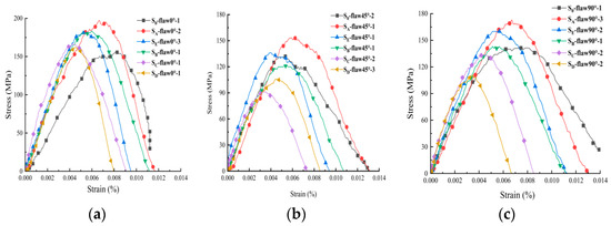 Dynamic stress-strain relationship under different axial static pressures for: (a) specimens with 0° flaw; (b) specimens with 45° flaw; (c) specimens with 90° flaw.