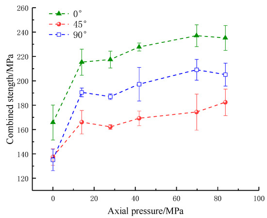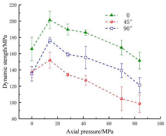 As shown in Figure 6 and Figure 7, with the increase in the applied static axial pressure, the dynamic strength showed an increasing trend and then a decreasing trend, reaching its maximum at an axial pressure of 14 MPa (10% UCS). The combined strength shows an overall increase at 0–14 MPa (0–10% UCS) axial pressure. When the axial pressure is from 14 MPa to 69.8 MPa (10–50% UCS), the strength exhibits a slight increase at 27.9 MPa (20% UCS) axial pressure. Afterward, the combined strength increases slowly in steps and decreases when the axial pressure is from 69.8 MPa to 83.8 MPa (50–60% UCS). Under a certain axial compression, the dynamic strength and combined strength of rock samples first decrease and then increase with the increase in fracture angle, which indicates that the changes in the parallel double fissure inclination angle can weaken the dynamic strength and combined strength, consistent with the results of numerous studies.